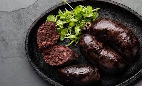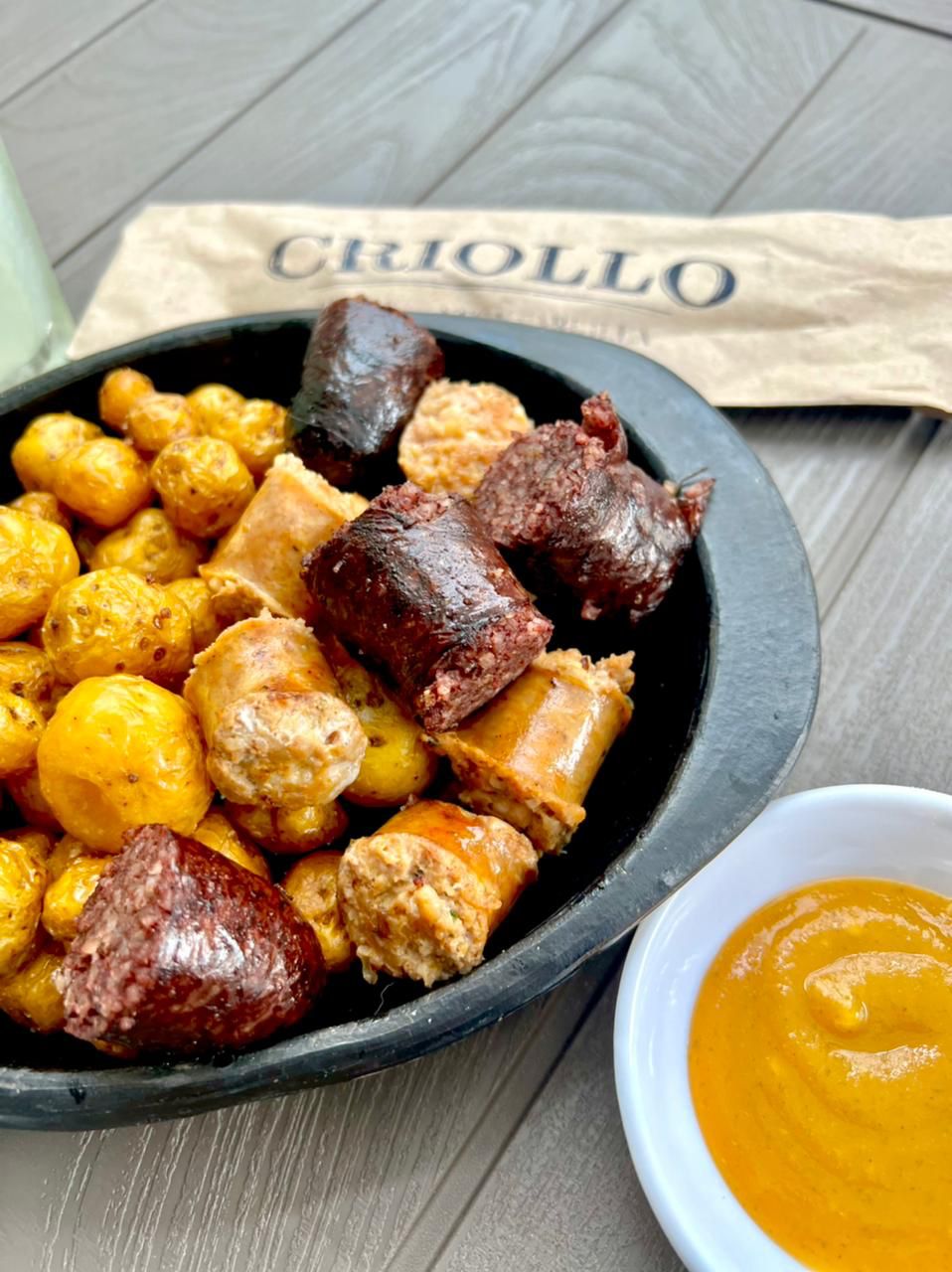 chorizo, morcilla, papa criolla y aparte aji de tomate de arbol