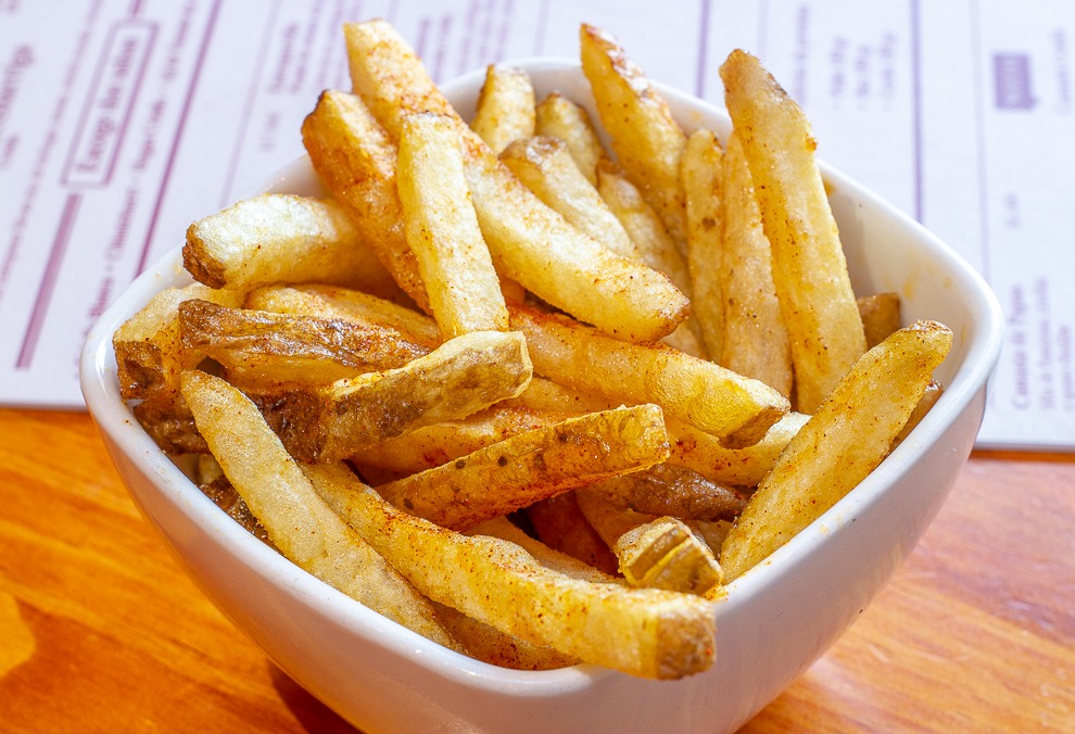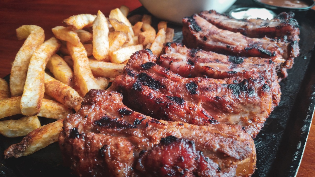 Costilla de cerdo en salsa BBQ de cerveza y miel, acompañada de papa a la francesa, ensalada fresca y salsas de la CASA.