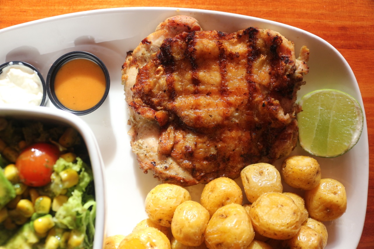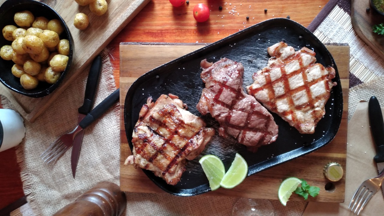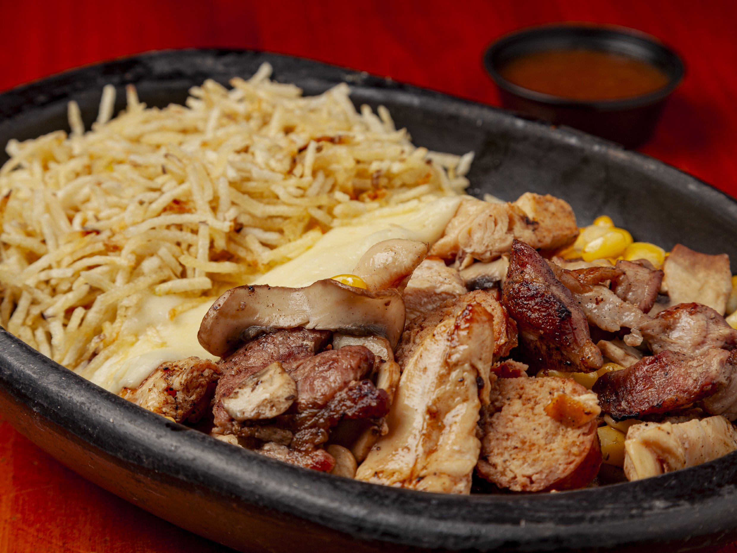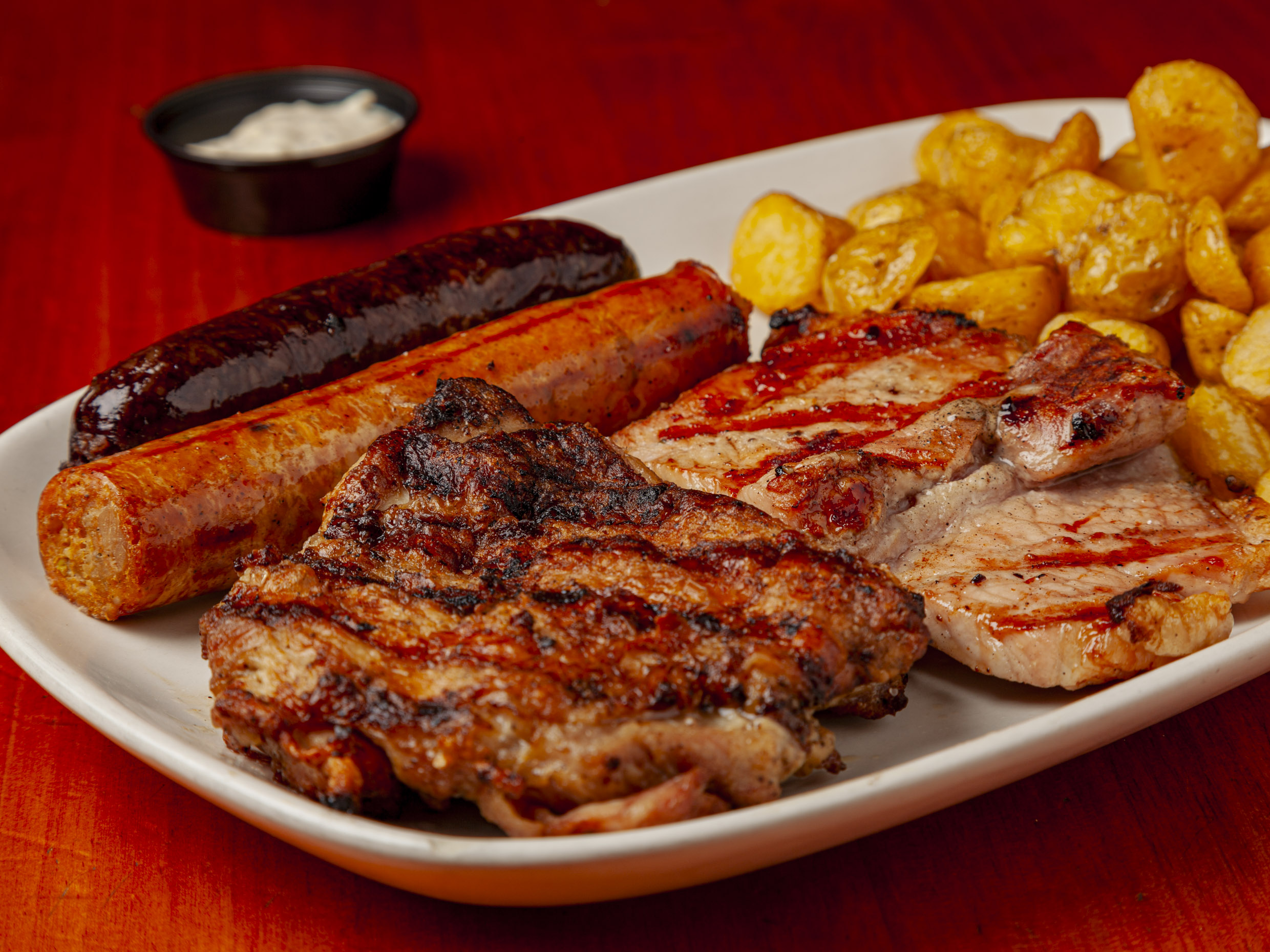 Un churrasco de cerdo (230gr), 1 pollo limon pimienta (300gr), 1 churrasco de res (200gr) acompañados de papas criollas, 2 nsaladas y salsas de la casa.