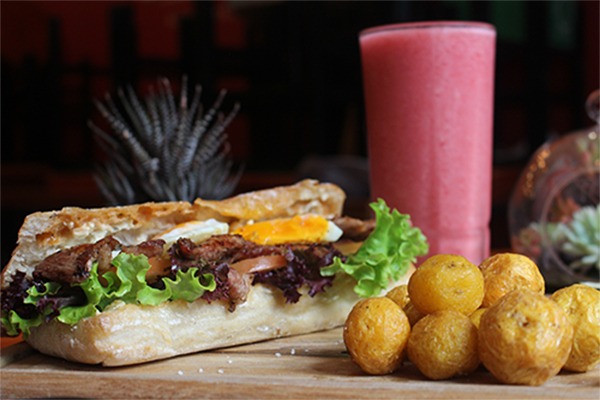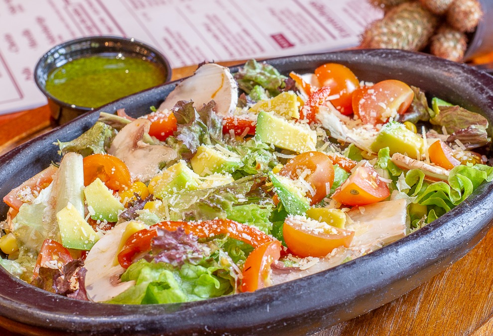 Ensalada de la casa con mix de lechugas, champiñones frescos, maiz tierno, pimentones asados, aguacate, mango, tomate cherry, queso parmesano y aderezo de albahaca y miel.
