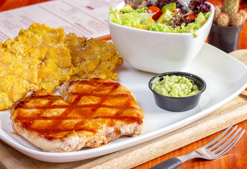 Churrasco de cerdo (230gr) en salsa bbq de la casa acompañado de patacon, ensalada fresca y guacamole.