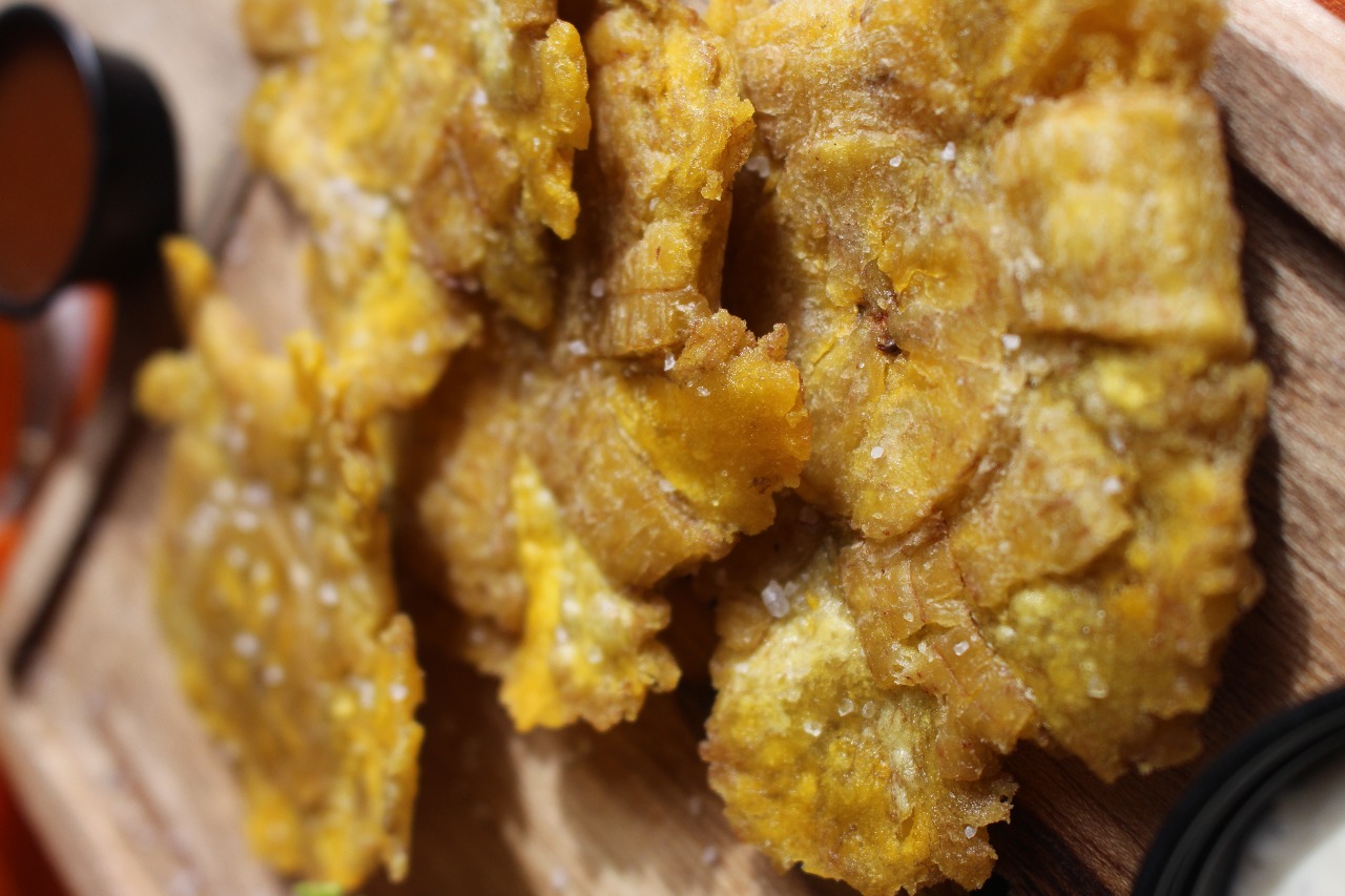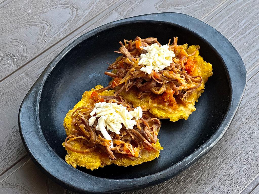 Dos patacones con hogao, sobrebarriga y queso campesino