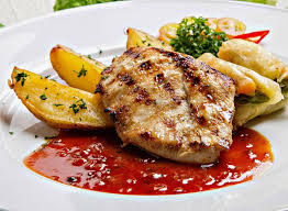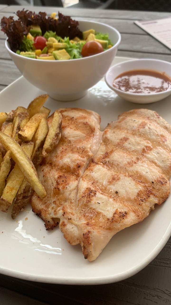 250 gr de pechuga a la parrilla acompañado de papa francesas, ensalada fresa y salsas de la casa