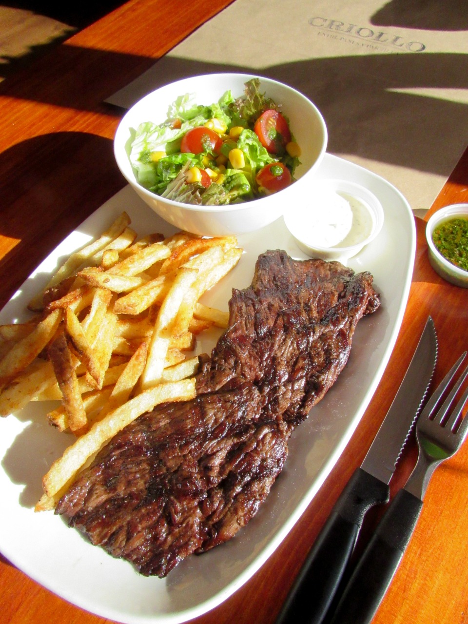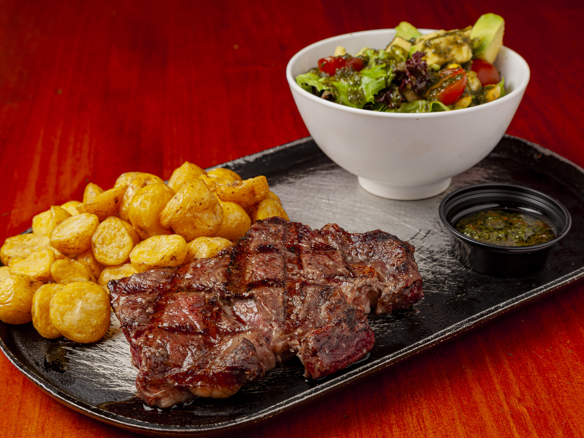 Churrasco (200gr) de chata madurada, acomañado de nuestro delicioso chimichurri, ensalada fresca y papa criolla.