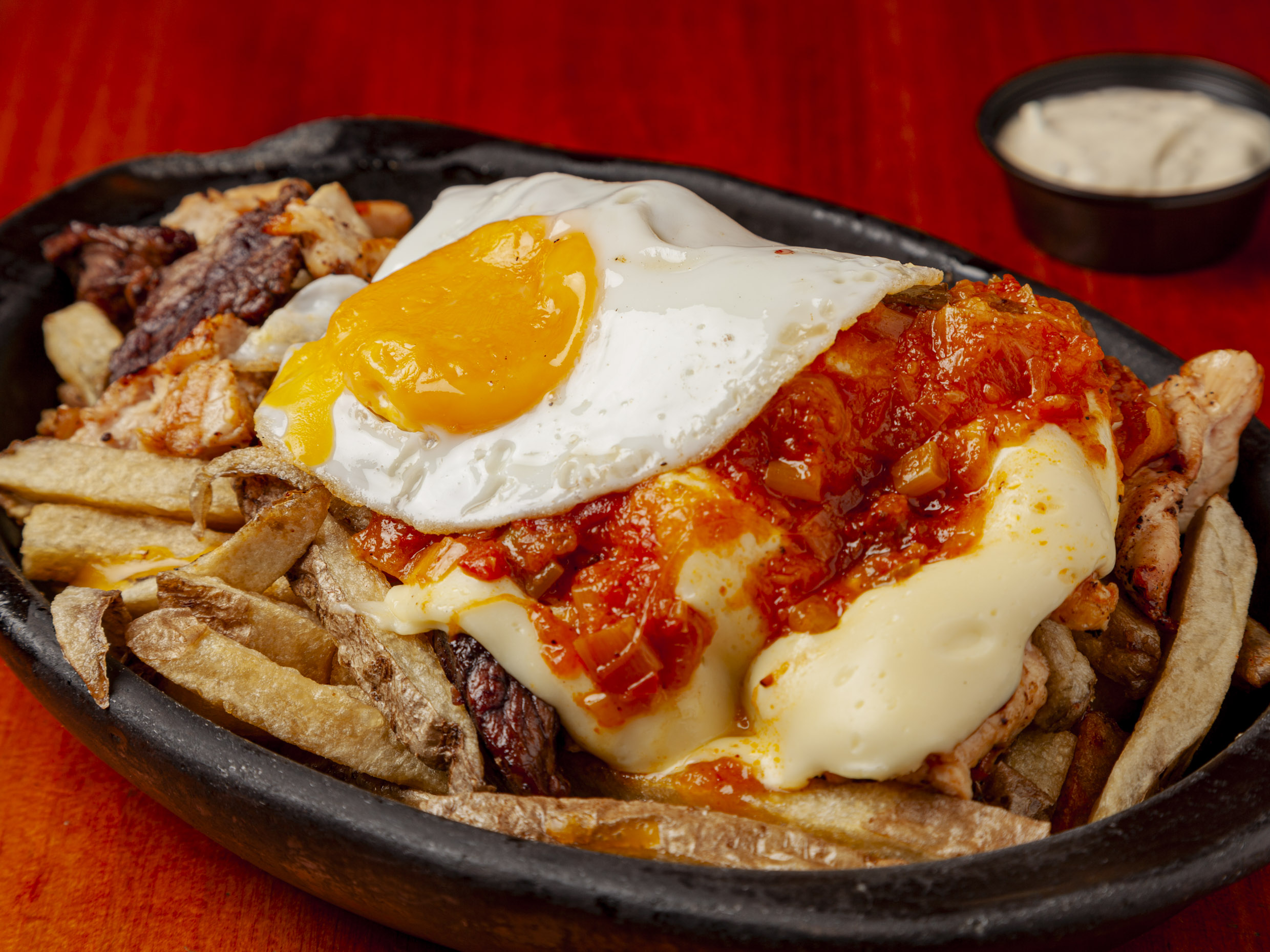 Escoge 2 proteinas, acompañadas de papa a la francesa, queso derretido, hogao criollo y huevo frito
