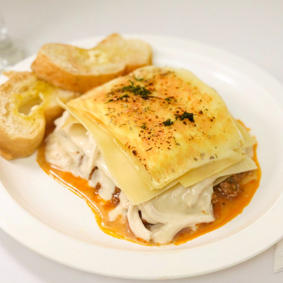 Carne molida sazonada al punto, entre capas de pasta y queso derretido, en una lasaña intensa que despierta el antojo desde el primer bocado.
