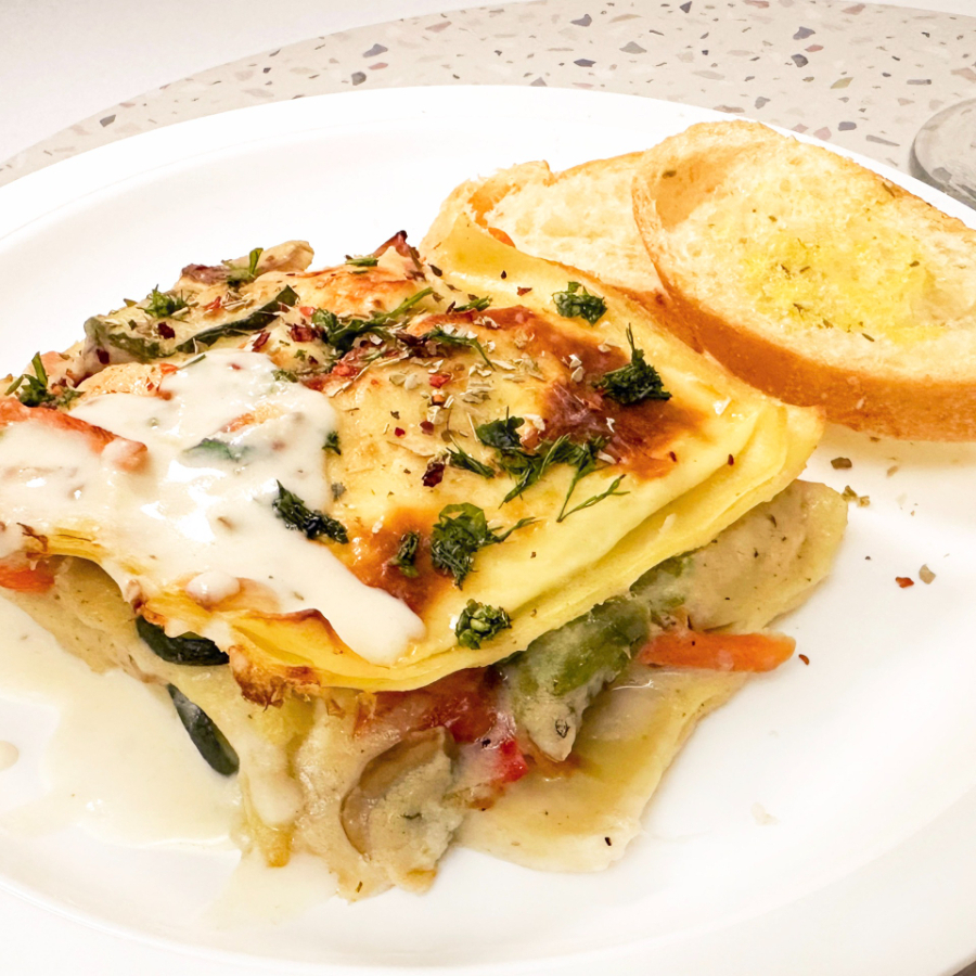 Una explosión de frescura con ingredientes cosechados directamente del campo: zucchinis, zanahoria,pimentón,cebolla y rúgula, entre capas de pasta artesanal con salsa bechamel y queso gratinado.Del campo a tu boca en cada capa de sabor.