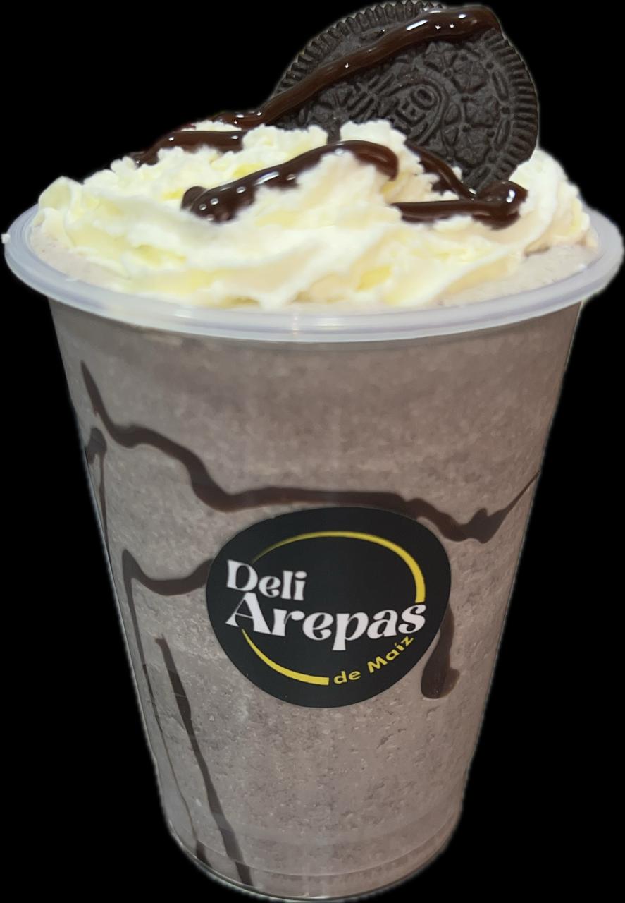 Nevado a base de galleta oreo, cubierto con crema chantilly, topping, salsas de chocolate, y leche.