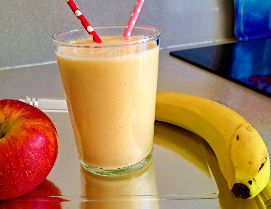 Jugo a base de pulpa de manzana, banano y naranja en agua.