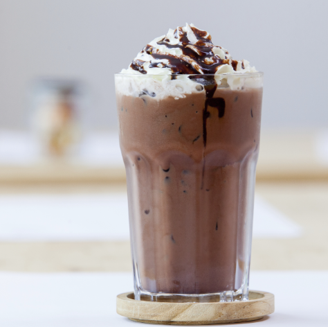 Nevado a base de chocolate y café cubierto con crema chantilly, topping salsas y leche.
