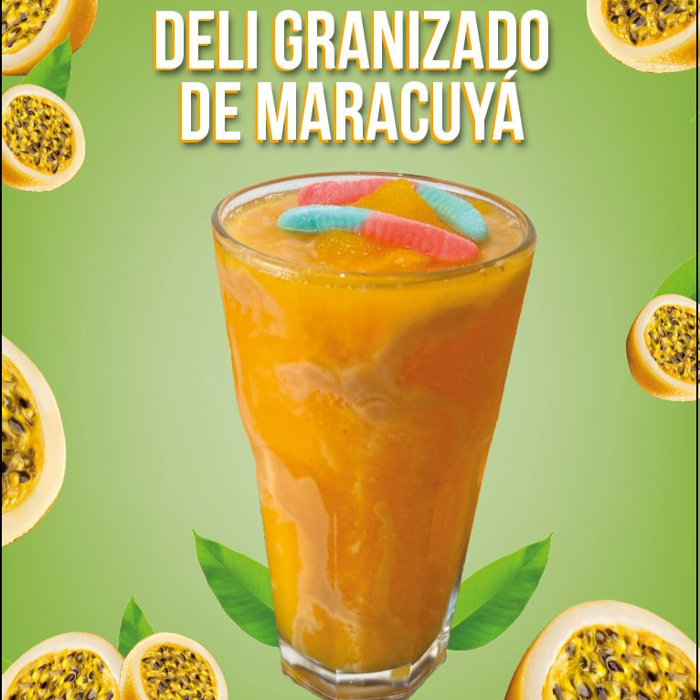 Granizado a base de pulpa de maracuyá acompañada con leche condensada y topping.