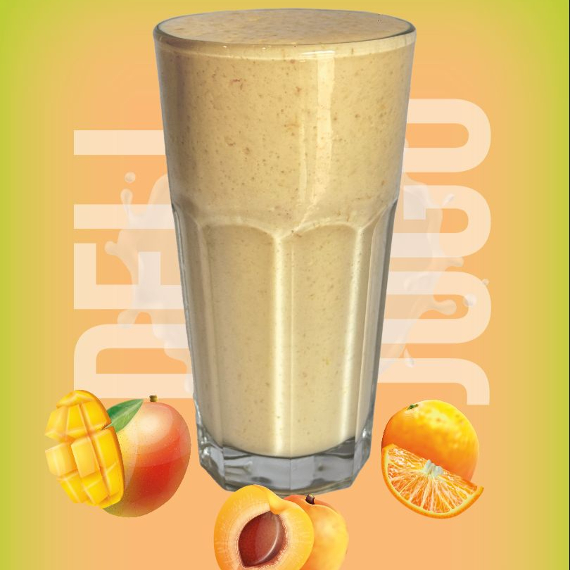 Jugo a base de melocotón, naranja y mango en yogurt o helado.
