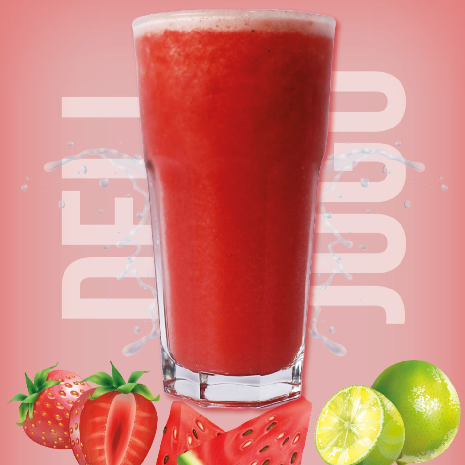 Jugo a base de pulpa de sandía, fresa y limón en agua.