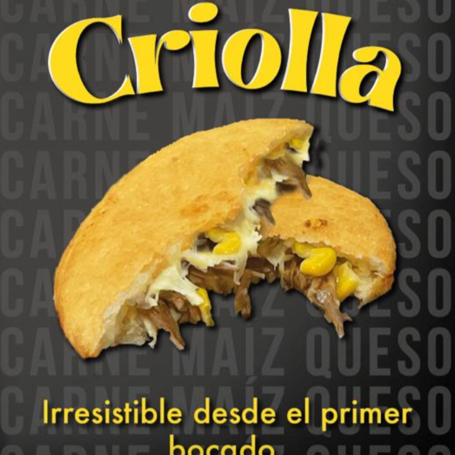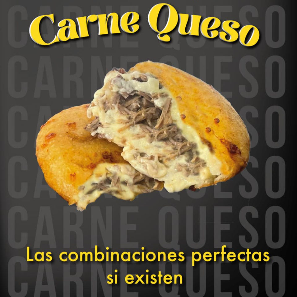 Arepa de maíz peto rellena de carne desmechada y queso mozzarella.