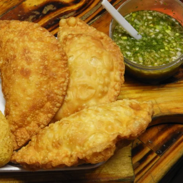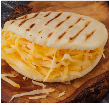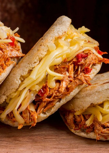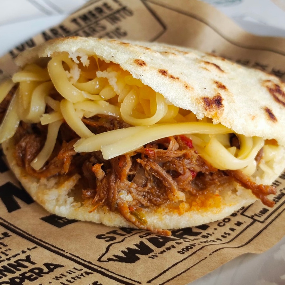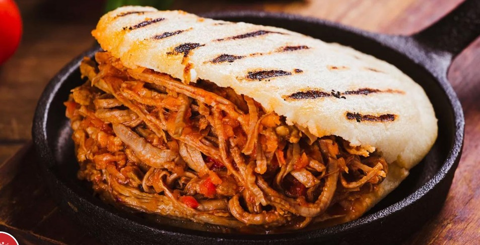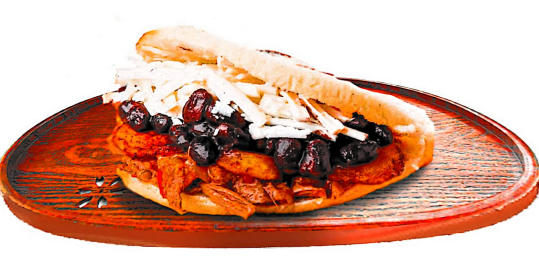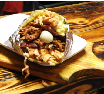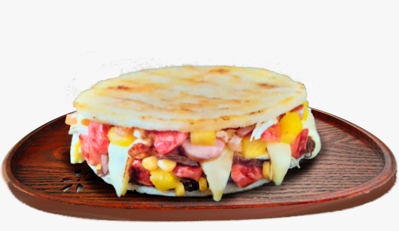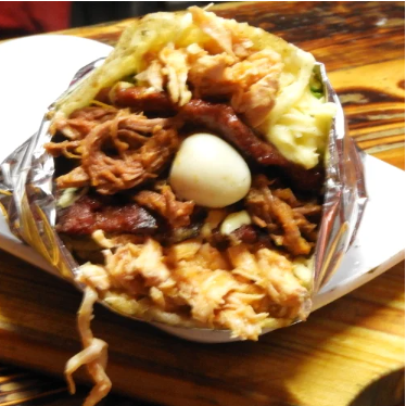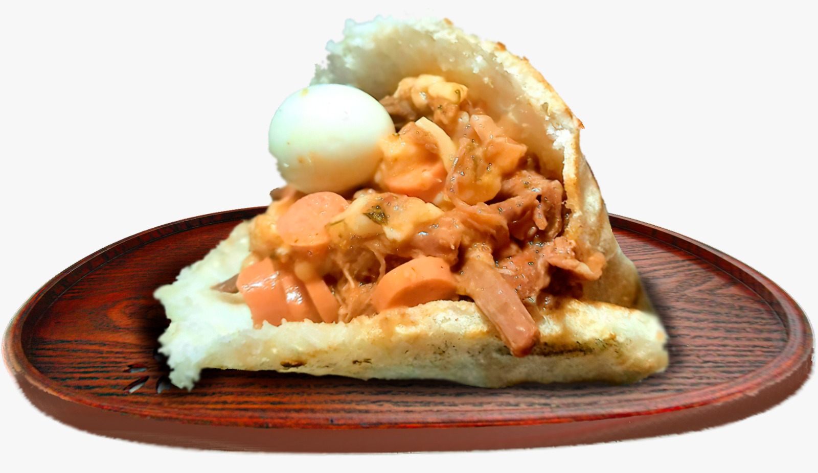 Carne desmechada con guisado acompañado albahaca y ajo, queso doble crema, salchicha de buena calidad y huevo de codorniz.