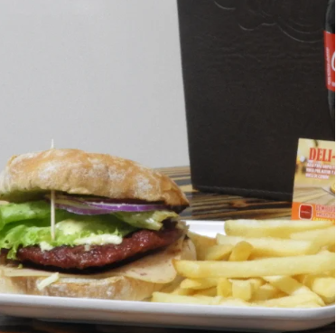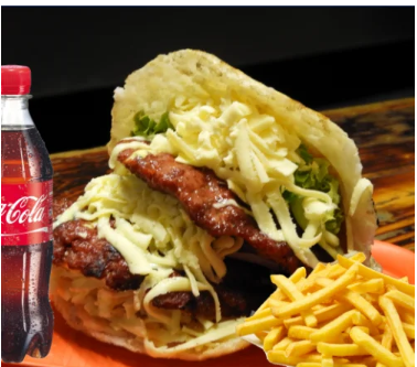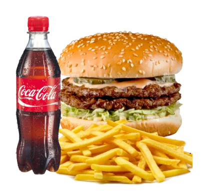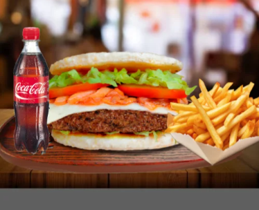 Doble carne, lechuga, tomate, queso y jamón acompañada con papas a la francesa y gaseosa 400 ml.