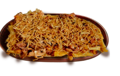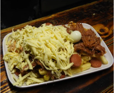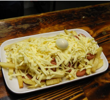 280 g De papas fritas, salchicha america, queso, carne desmechada, pollo y huevo de codorniz.