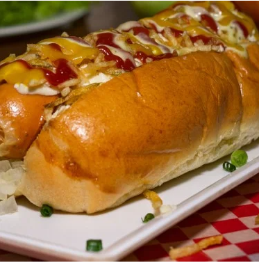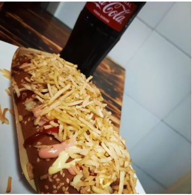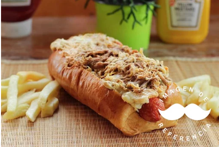 Pan, salchicha de buena calidad, pollo y carne desmechado, queso derretido, papas chip, huevo de codorniz.
