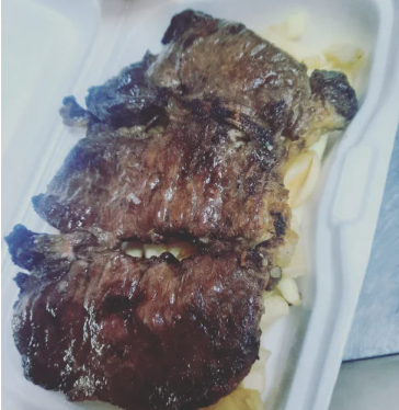 Churrasco asado al carbón, 240 g de papas fritas y porción de arroz.