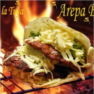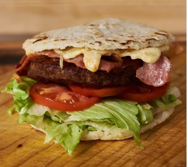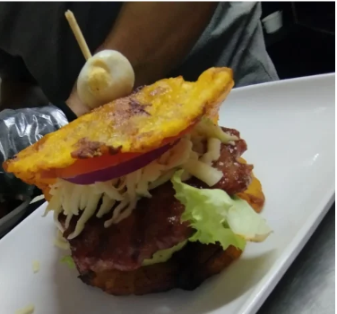 Patacón con forma de hamburguesa lechuga, tomate, queso, carne hecha en casa, salsa de casa y huevo de codorniz.
