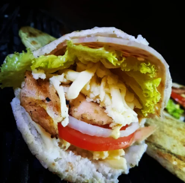 Pechuga asada a carbón, vegetales frescos, queso, jamón y salsa de la casa.