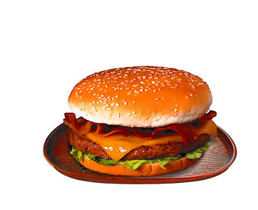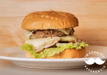 Doble carne de hamburguesa hecha en casa, vegetales frescos, queso, jamón, salsa de la casa