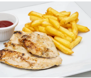 Pechuga de pollo asado al carbón, 240 g de papas fritas y porción de arroz.