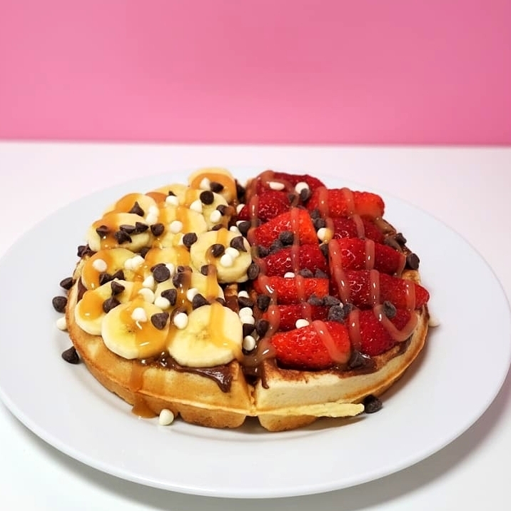 Waffle de 16 Cm, base dulce, 2 frutas, salsa artesanal, 2 toppings, salsa dulce.
