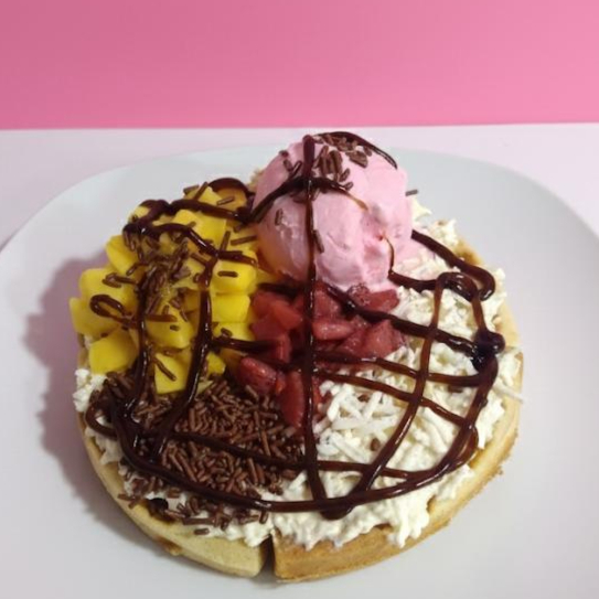 Waffle de 16 cm, acompañado de queso con crema de leche, 1 bola de helado, 1 fruta, salsa dulce, salsa artesanal, 1 topping.