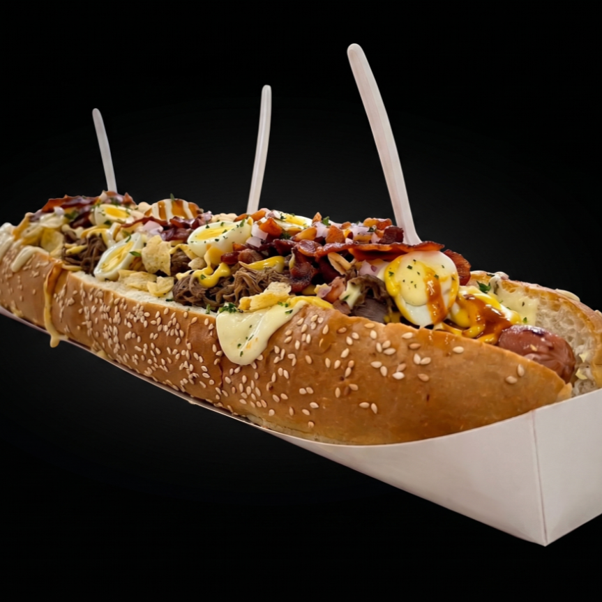 Pan artesanal o de ajonjolí (A disponibilidad), doble carne de res artesanal aprox. 120 g cada una; jamón, tocineta, queso, papas chips, tomate, cebolla, lechuga y aderezos.
