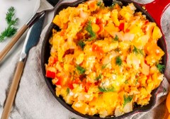 Huevos pericos con cebolla, tomate y arroz. (Porción Personal)