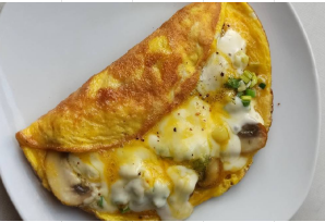 Huevos batidos con mantequilla, champiñones y quesito, acompañados de pan y bebida caliente a elección.