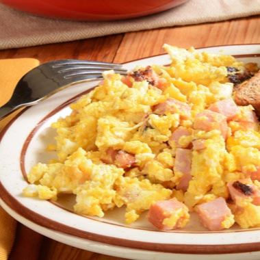 Huevos batidos con mantequilla, jamón y quesito, acompañados de pan y bebida caliente a elección.