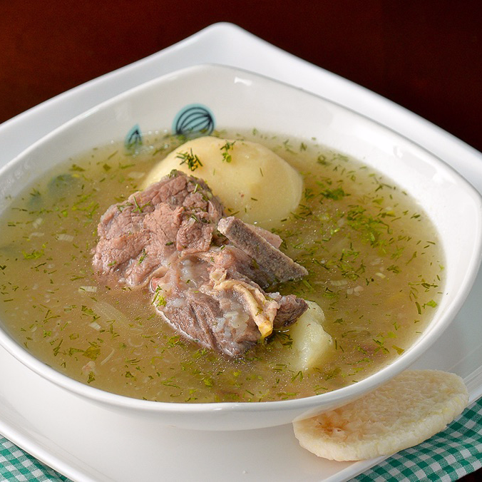 Caldo de costilla, acompañado de arepa blanca, pan de la casa, tamal tolimense y bebida a elección.