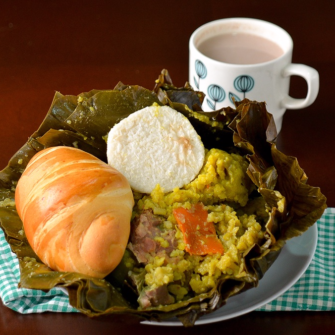 Tamal tolimense, hecho a base de maíz y arroz con presa de pollo, carne y tocino, envueltos en hoja de plátano, acompañado de arepita blanca, pan y bebida caliente a elección.
