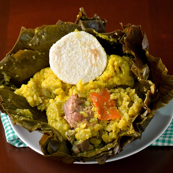 Hechos a base de maíz y arroz con presa de pollo, carne y tocino, envueltos en hoja de plátano, acompañado de una arepita blanca.