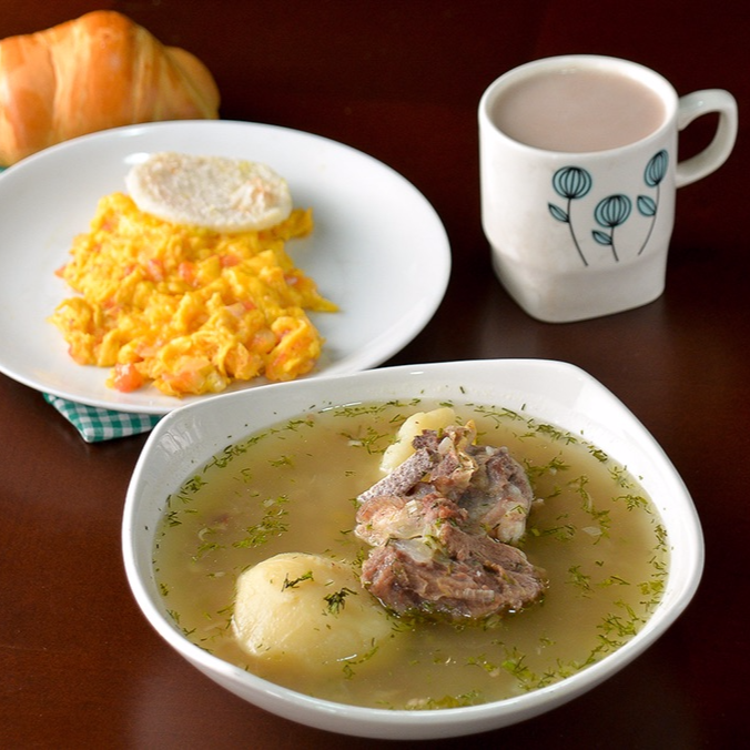 Caldo de costilla, acompañado de arepa blanca, pan de la casa, huevos al gusto y bebida a elección.