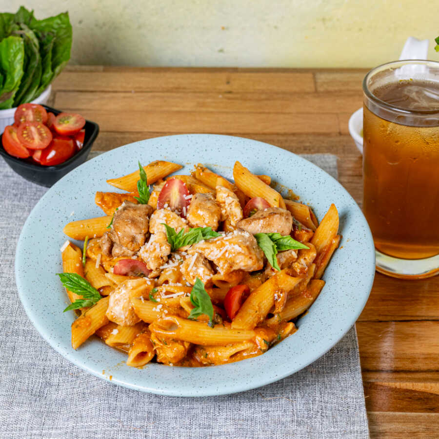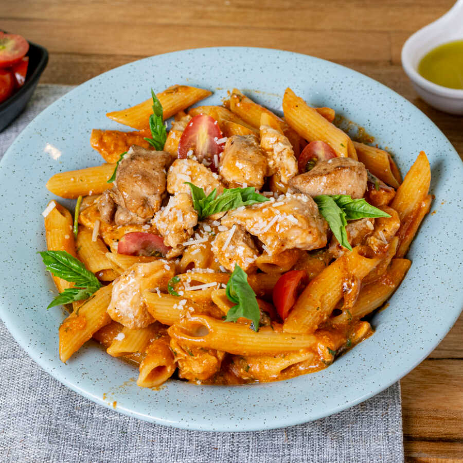 La salsa de napoles, delicia italiana a base de tomates frescos confitados en aceite de olivo, albahaca, pollo y quesos. Recibe tu pasta acompañada de pan pita artesanal.