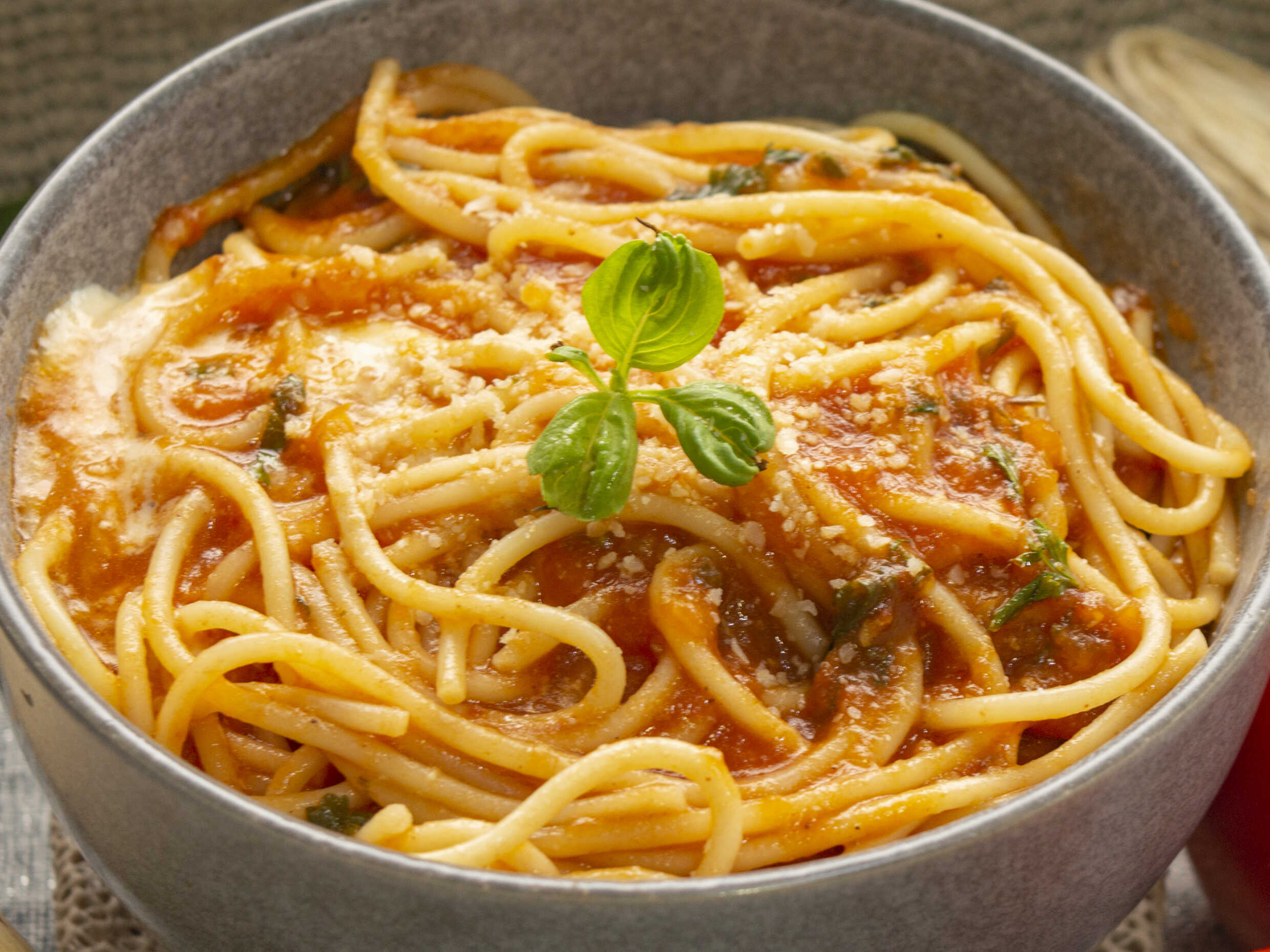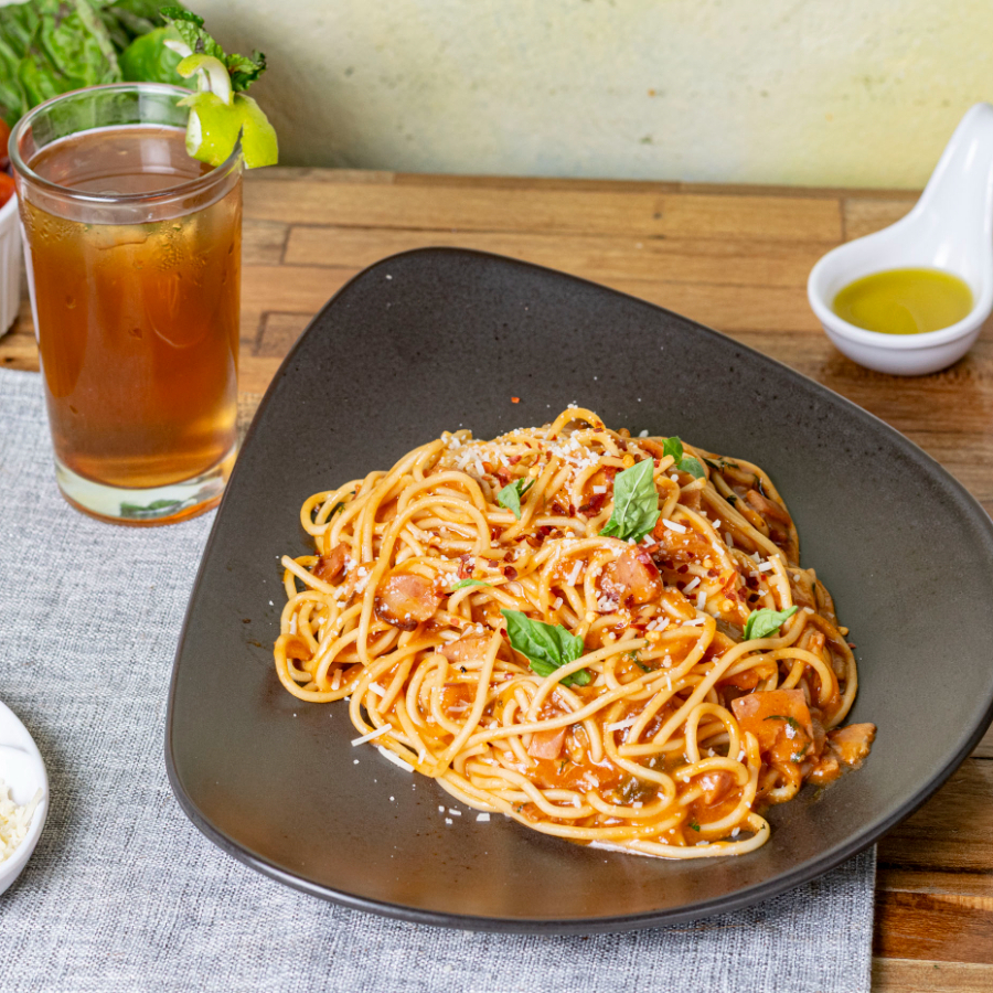 Pasta spaguetti con salsa de napoles, delicia italiana a base de tomates frescos confitados en aceite de olivo, albahaca y quesos, acompañada de pan de la casa, té frio natural, limón diciotto y brownie de chocolate.