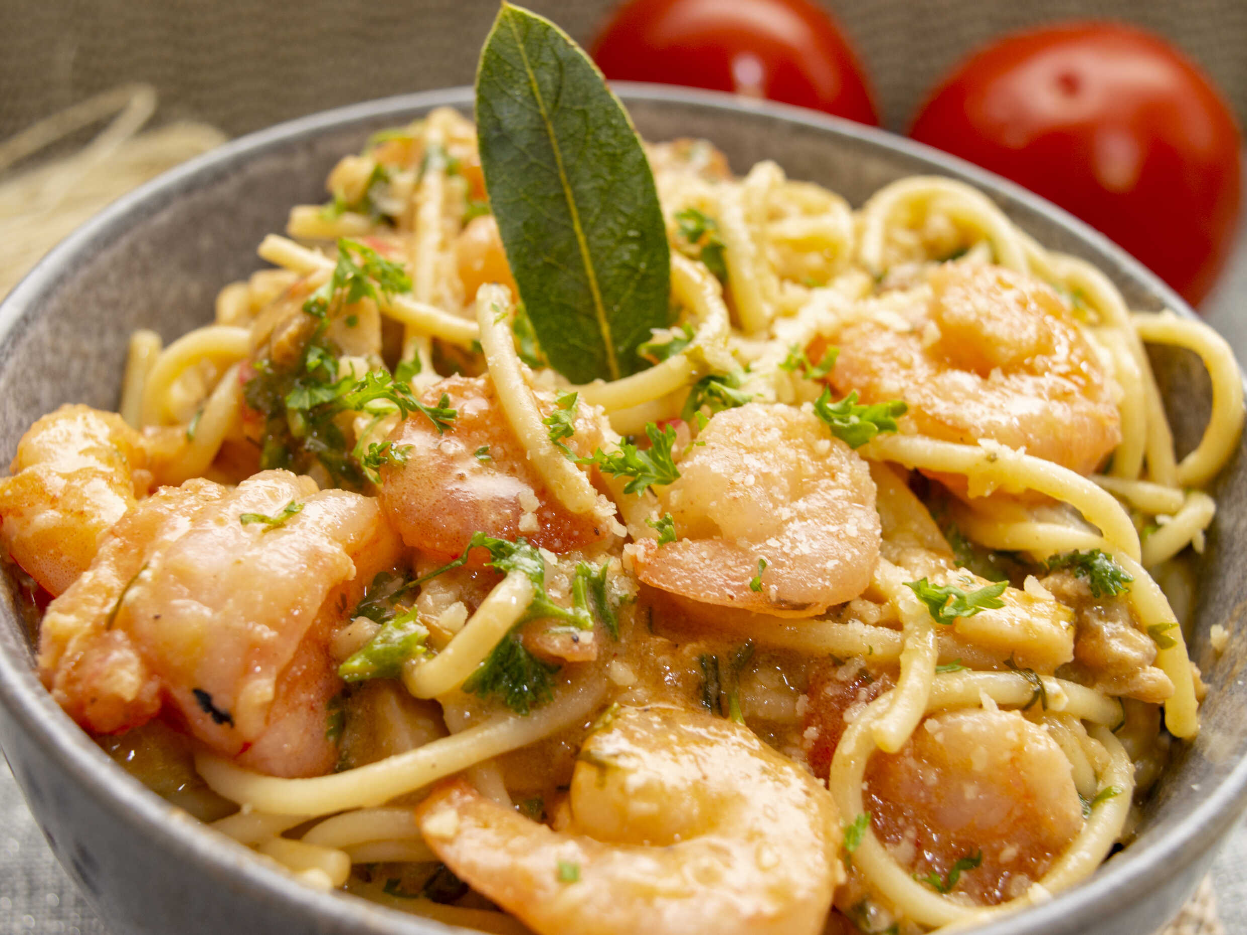 Salsa tradicional marinera a base de mixtura de mariscos seleccionados, con crema de leche, camarones 80 gr y queso parmesano. Recibe tu pasta acompañada de pan pita artesanal.
