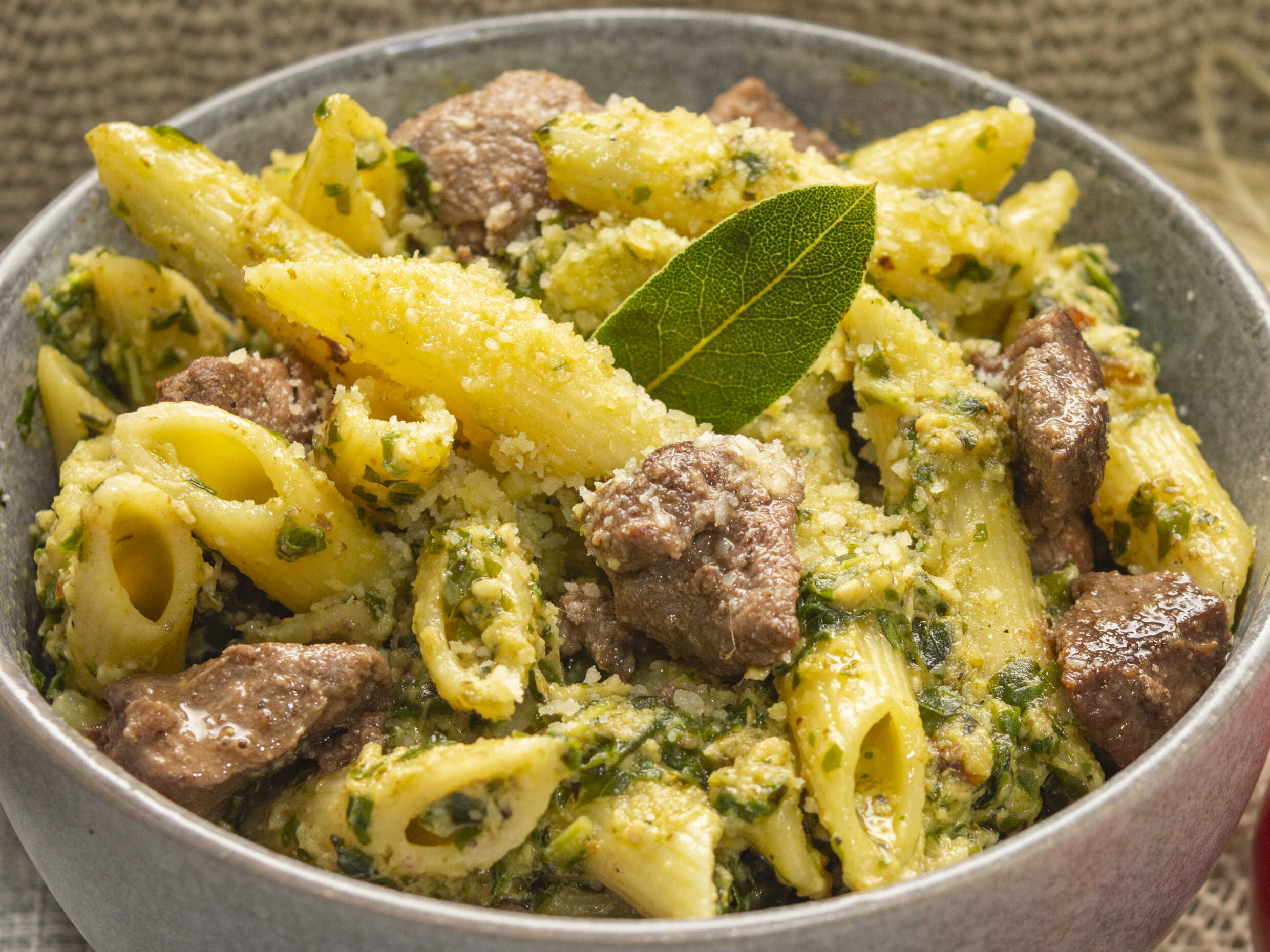 Pasta Pesto (Proteina a Elegir) con pan pitta.