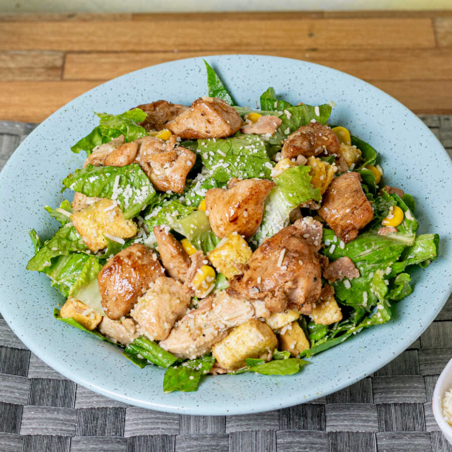 Crujiente lechuga, trocitos de tocineta(50gr) maíz tierno (50gr) y cubos de pechuga salteados(120gr) queso parmesano fresco, pan pita cortado. aderezo.