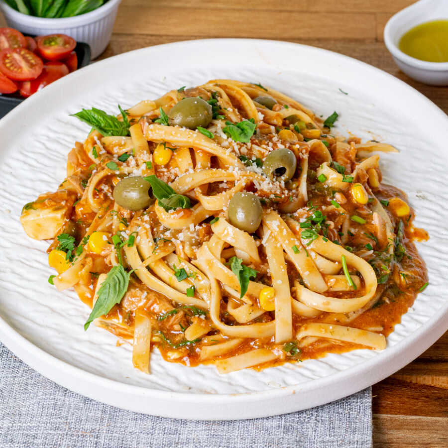 Deliciosa pasta con 120 gramos de atun, maiz tierno, cebollin en salsa roja.