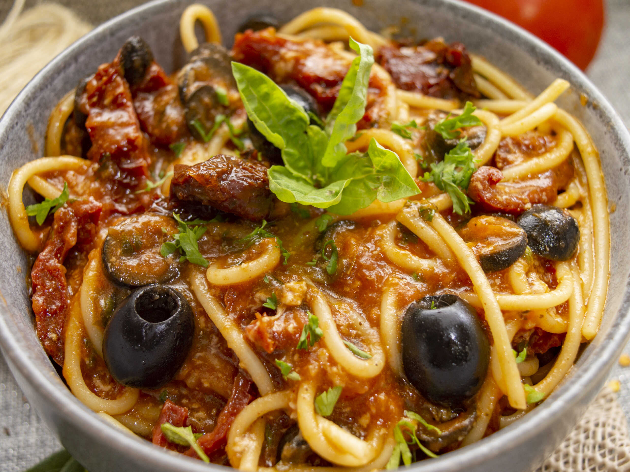 Pasta de napoles en salsa napolitana con aceitunas negras y tomates confitados. 250 gr de pasta a elegir. .