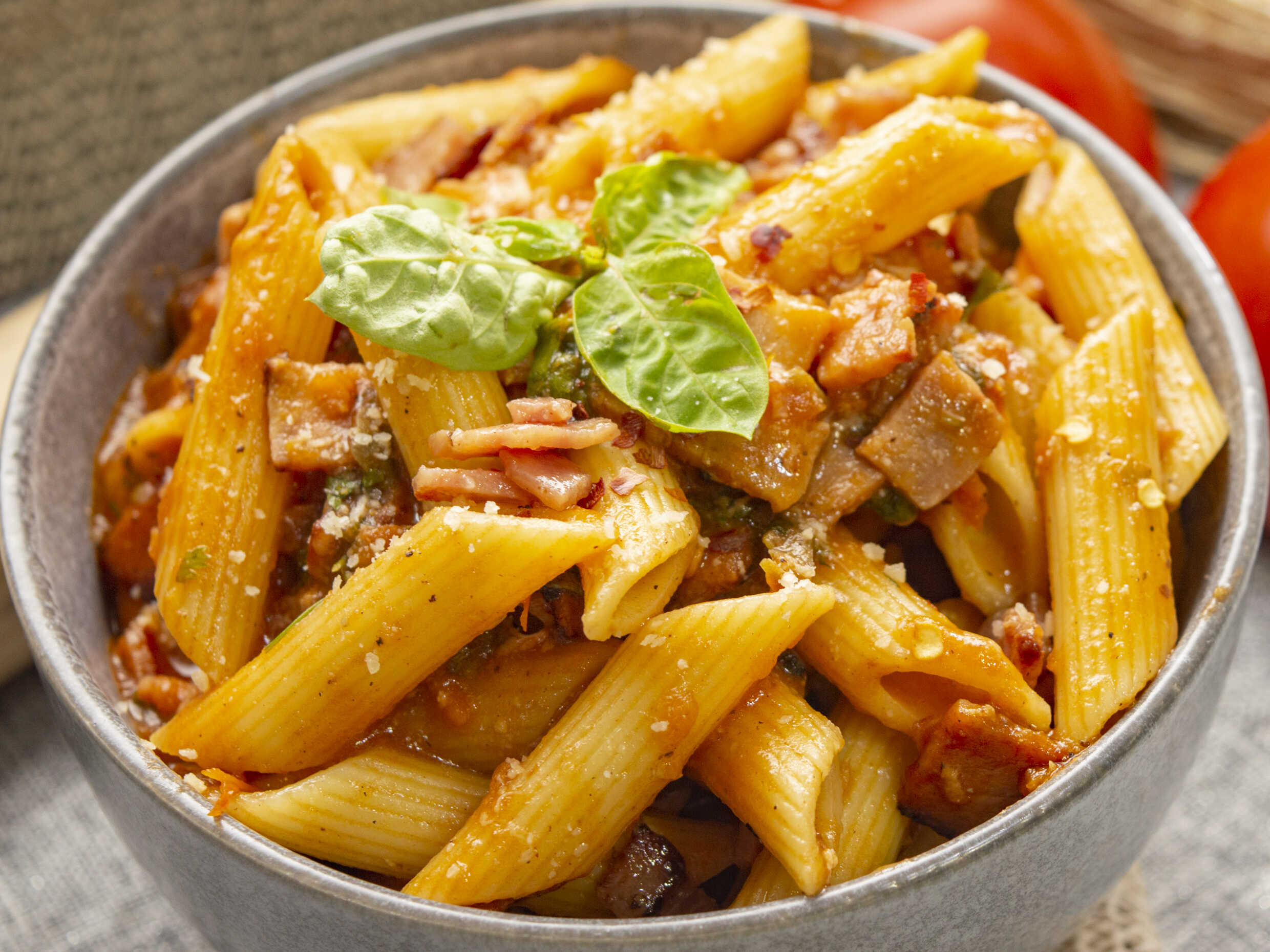 Pasta con salsa roja, a base de tomates, ajo y aceite de oliva mesclada con tocineta y peperonccino. (pasta picante) con acompañamiento de pan pita.