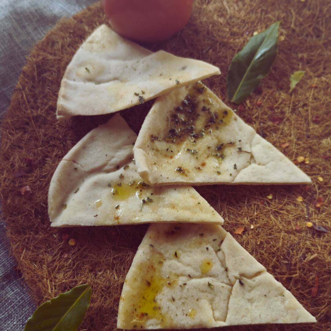 Porción de pan pita recien horneado con aceite de oliva y oregano.