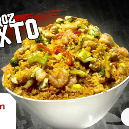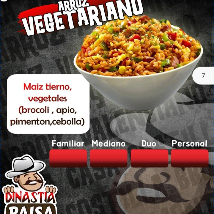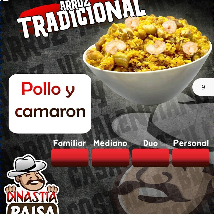 Trocitos de pollo, camarón, vegetales( brocoli, apio, pimentón y cebolla)
