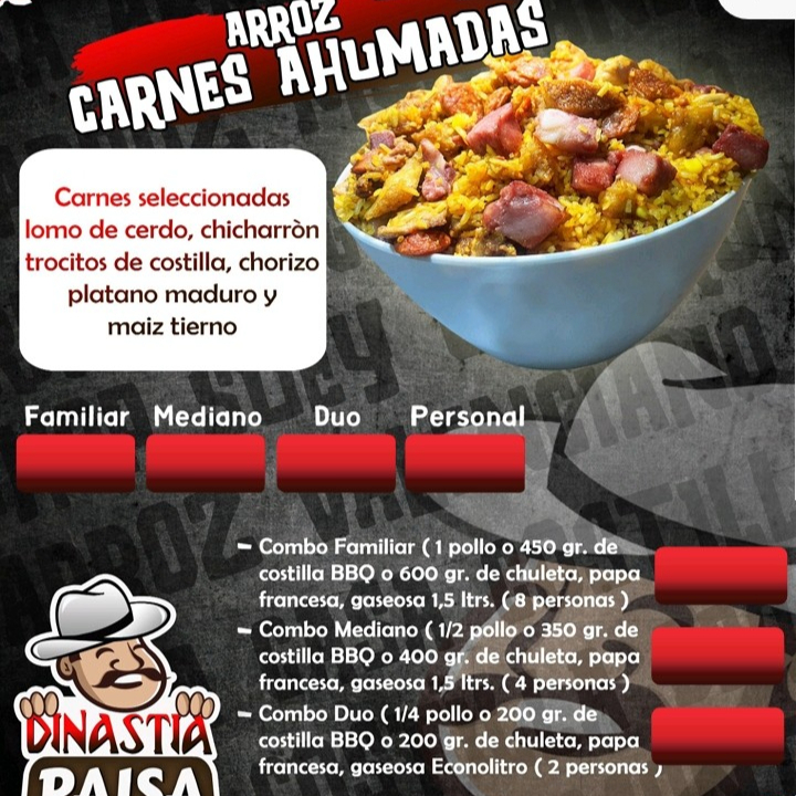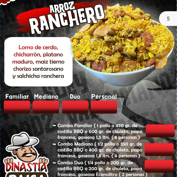 Trocitos de lomo de cerdo, plátano maduro, chicharrón, chorizo Santarrosano , maíz y salchicha ranchera .