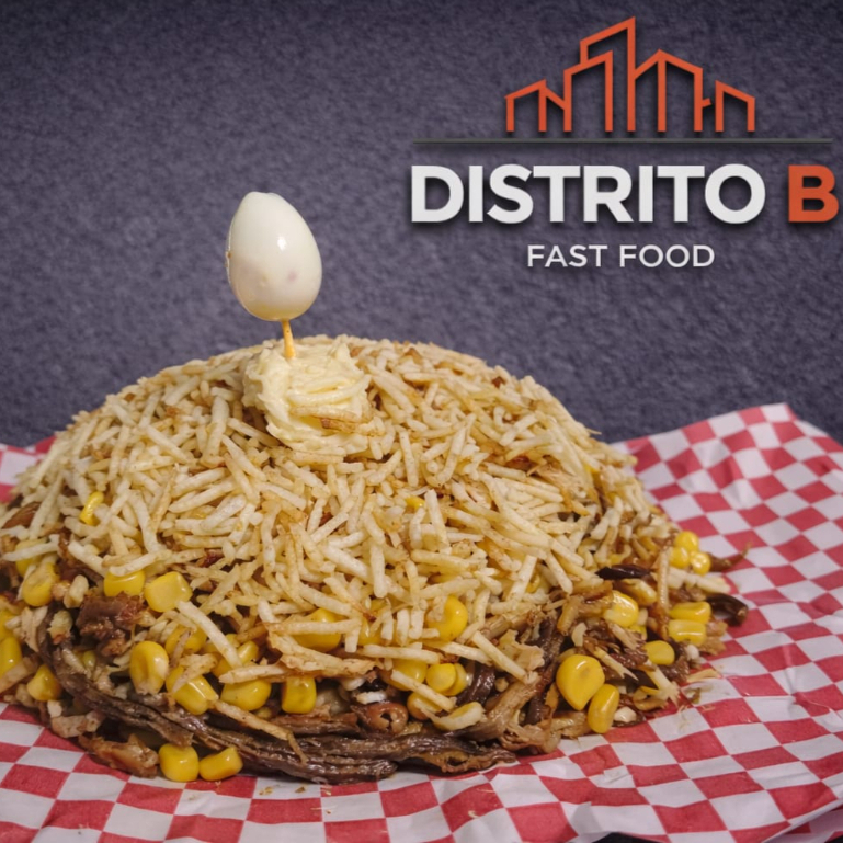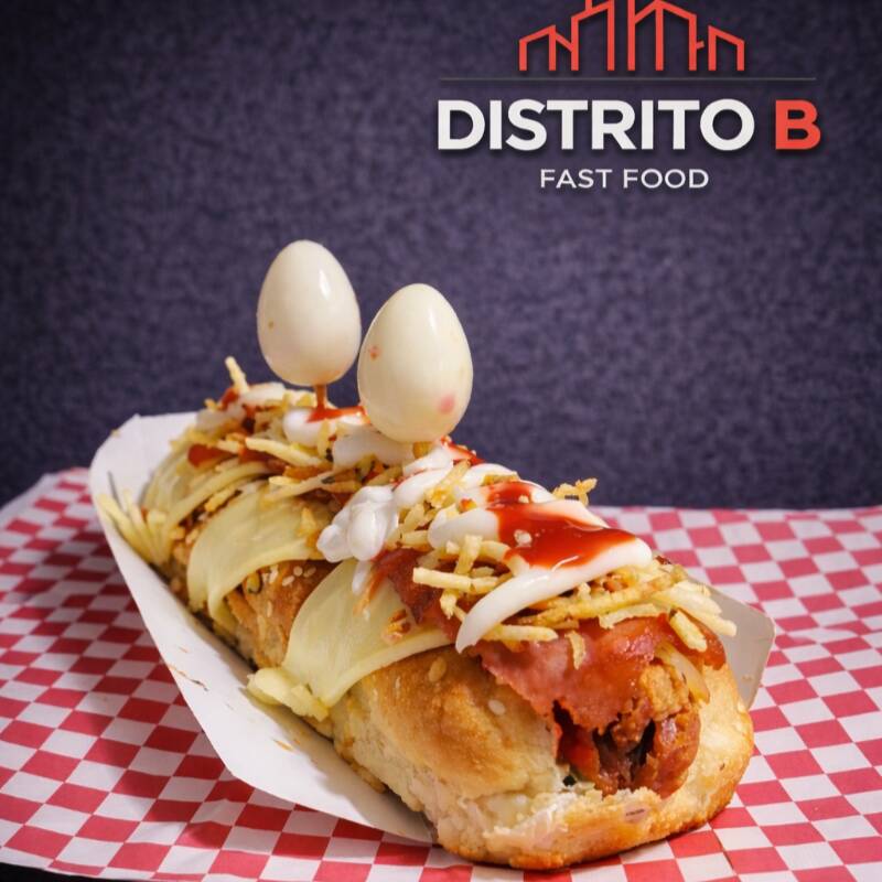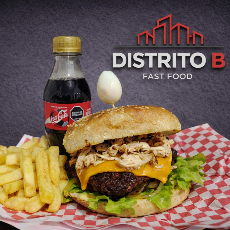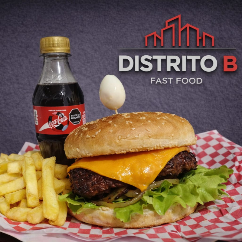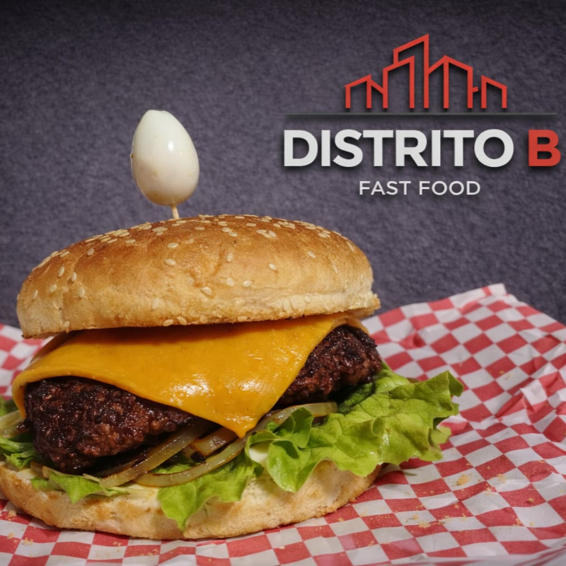 140gr | Carne de res jugosa a la parilla, queso cheddar fundido, lechuga fresca, tomate, cebolla caramelizada, huevo codorniz y salsas especial Distrito B