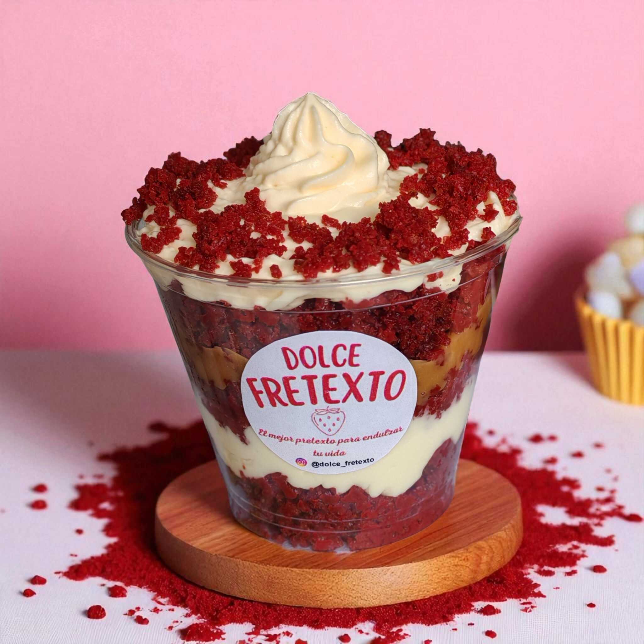 Cake red con notas intensas de cacao, frosting de queso crema y arequipe.